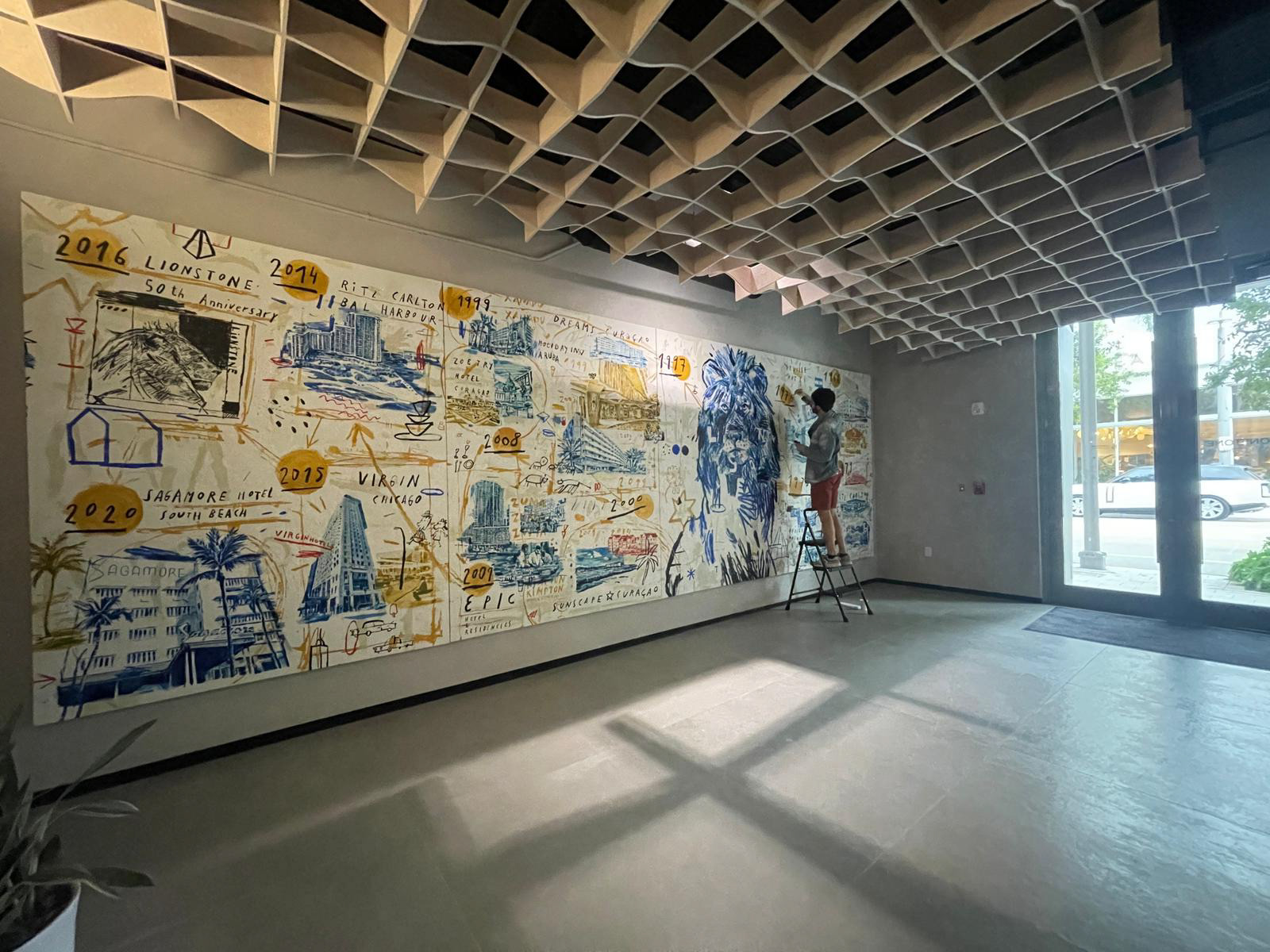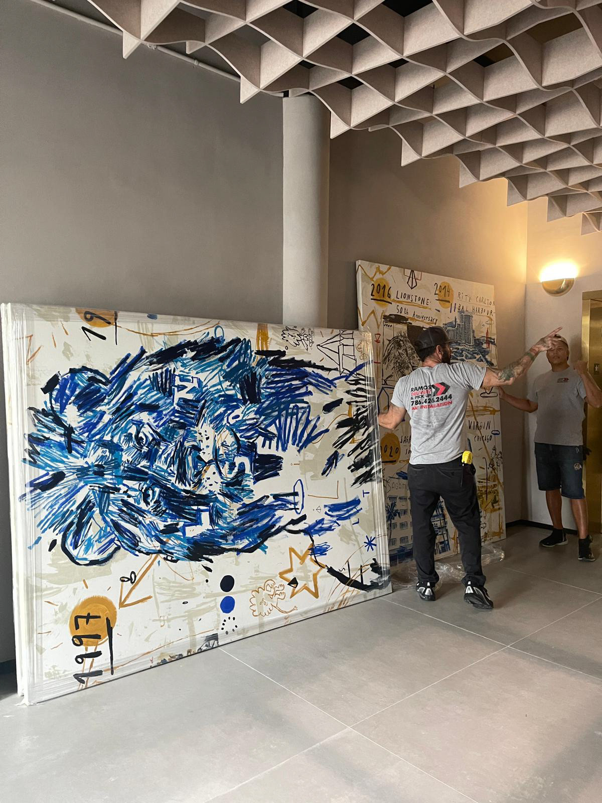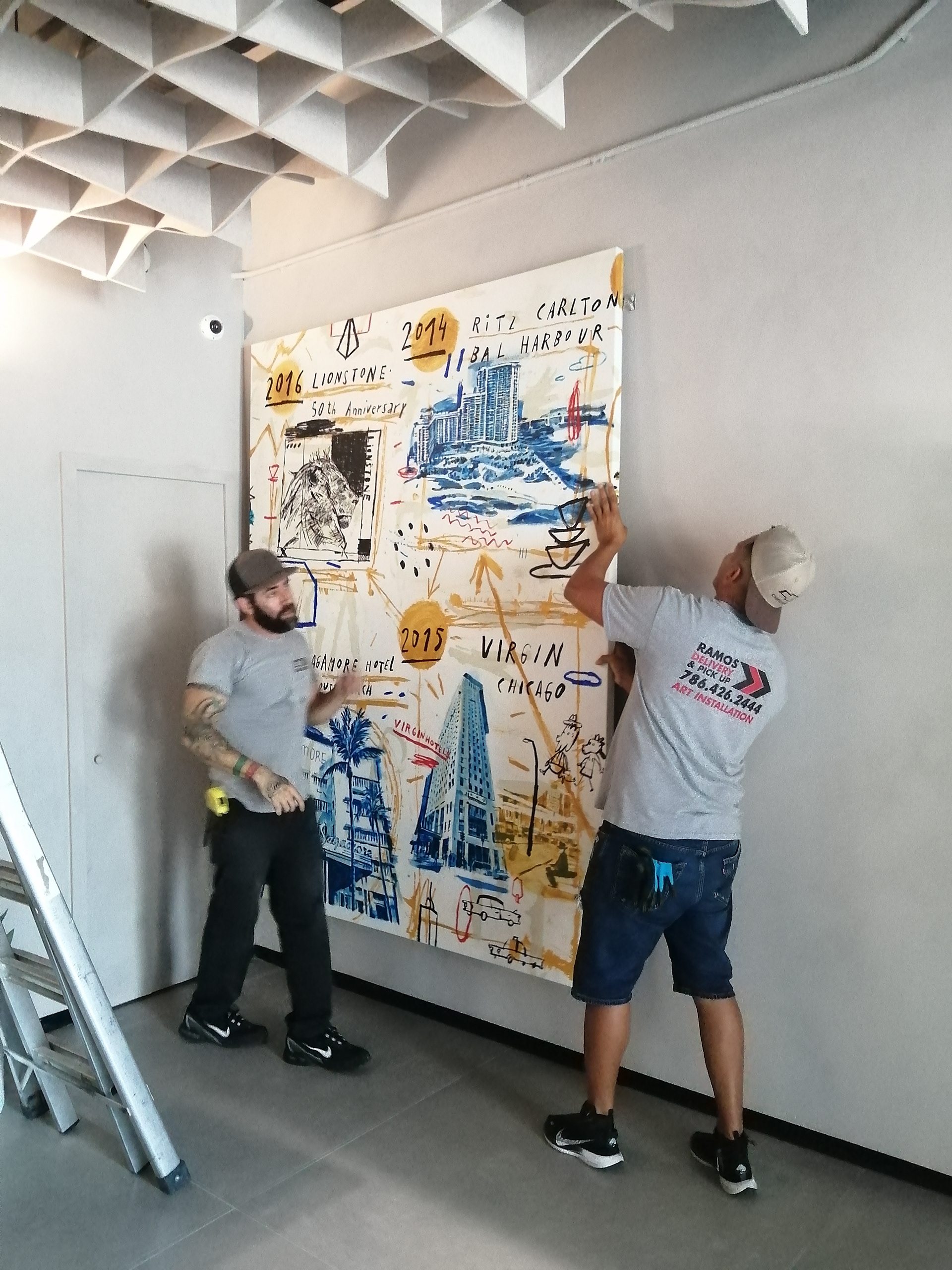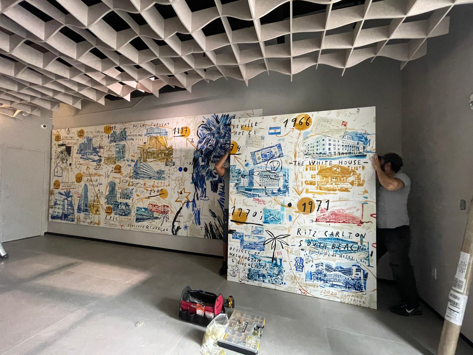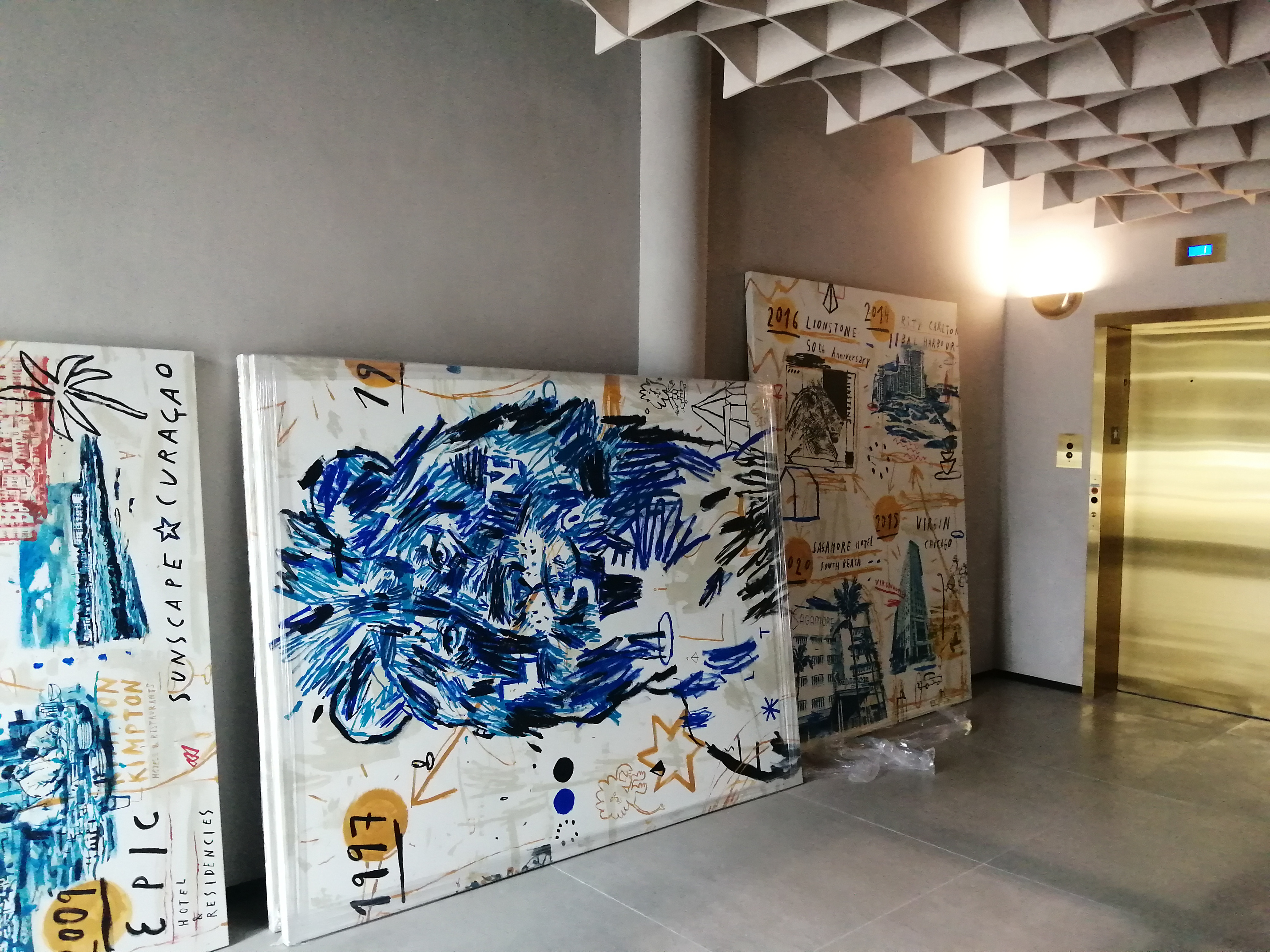 Four-panel, large-format,100% hand-made painting on fabric, conceived to be displayed at the entrance of the Lionstone headquarters in Miami, Florida.